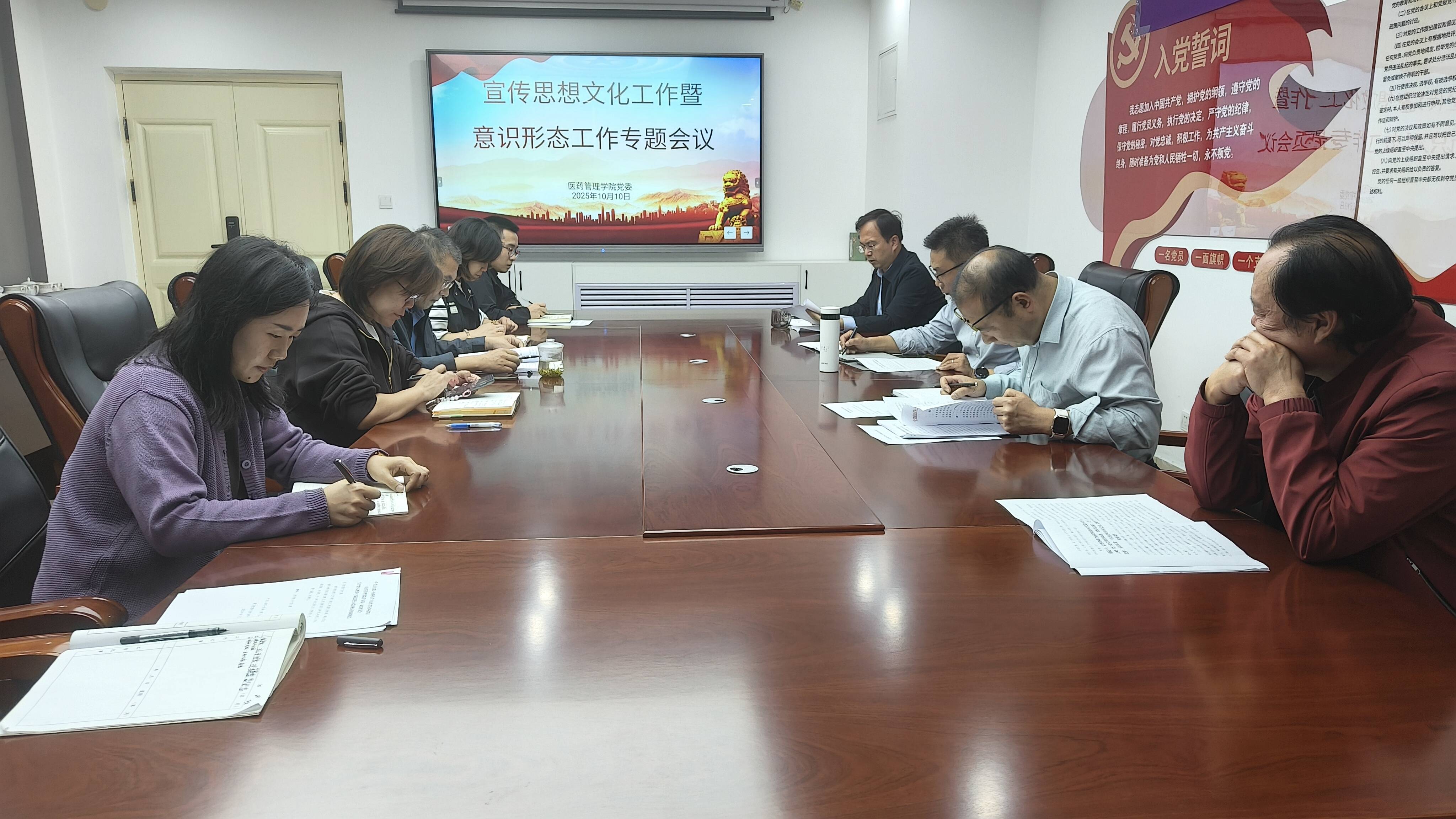 为深入学习贯彻习近平总书记关于宣传思想文化工作的重要指示精神,全面落实校(院)关于宣传思想文化和意识形态工作的决策部署,10月10日,医药管理学院在会议室召开2025年下半年宣传思想文化暨意识形态工作专题会议。学院领导班子成员、党支部书记、科级干部及全体辅导员参加会议,会议由学院党委书记苏宝利主持。
