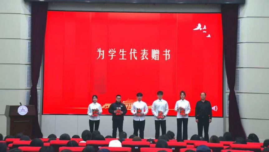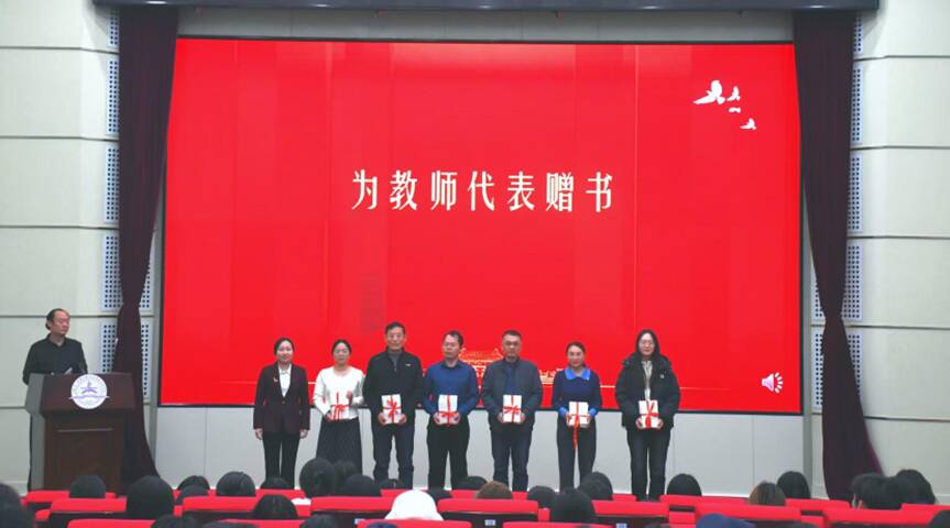 仪式现场,孙琳婧为教师党员代表赠送《何以中国》《苏东坡和他的世界》《给青年干部的 21 封信》三本书籍,并阐明此次赠书活动的深刻意义。她指出,书籍是传承文明的载体,是坚定信仰的基石。这三本书籍分别从文明根脉、文人风骨、成长担当三个维度,为教师党员感悟传统文化、涵养师德师风、践行使命初心提供思想指引。此次赠书既是学院推进党建与师德师风建设深度融合的具体举措,也是引导教师党员以文化素养赋能教育教学的重要抓手。她希望全体教师党员以书为友、以学促行,将读书所得转化为履职尽责的实际成效,把文化自信与党性修养融入人才培养全过程。