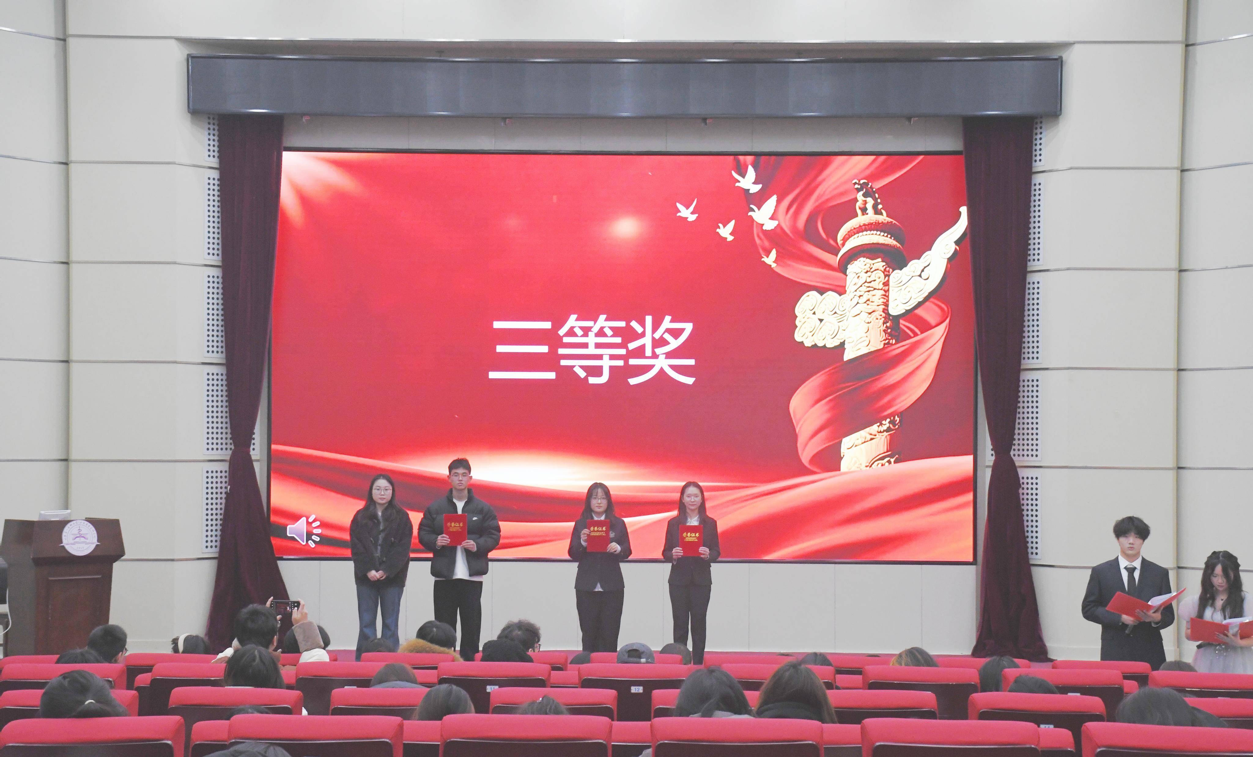本次竞赛节奏紧凑、形式丰富,依次设置必答、抢答、亲友团助力、红歌竞猜与抗战英雄宣讲环节:必答环节的二十道题目覆盖抗战历史与英雄事迹,全面考验选手知识储备;抢答环节以两两对决形式展开,极致挑战反应速度;赛事中段穿插 “经典红歌竞猜” 互动环节,观众通过抢答歌名或相关人物可赢取精美礼品;紧随其后的亲友团助力环节邀请台下亲友协同作答,让竞赛超越个人胜负,彰显团队支持与共同奋斗的价值;竞赛最后,参赛队伍逐一宣讲英雄事迹,将爱国主义教育深度融入其中,让崇高精神在青年心中生根发芽。