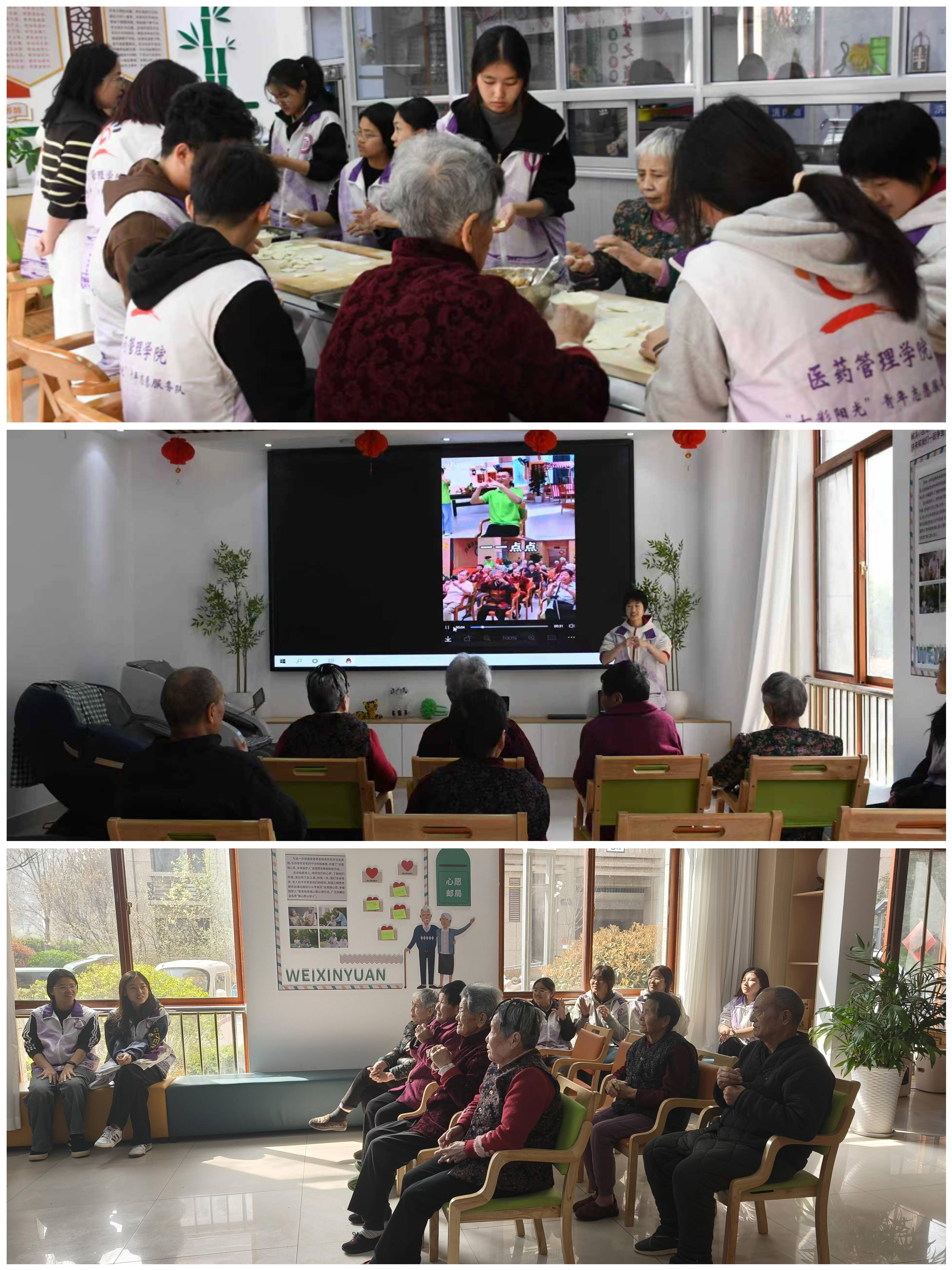 金晖映晚晴,暖意润心田。活动当天,志愿者们早早抵达现场,迅速投入到三个环节的志愿服务中。首先是包饺子环节,志愿者们与老人围坐在一起,和面、擀皮、调馅、捏褶,大家有说有笑,气氛温馨融洽。老人们一边手把手教志愿者包饺子的技巧,一边分享自己年轻时的奋斗故事与人生感悟,志愿者们认真倾听,在欢声笑语中拉近了彼此的距离。随后,志愿者们带领老人做起轻松有趣的手指操,伴随着轻快的音乐,老人们跟着节奏活动手指、舒展关节,志愿者们耐心示范、细心指导,现场气氛活跃而欢快。最后是观影陪伴环节,志愿者们为老人播放了经典影片,大家围坐在一起边看边聊,志愿者们不时为老人讲解剧情,用贴心的陪伴传递温暖与关怀。